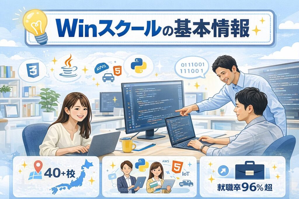 全国40校以上の教室とオンライン受講を組み合わせ、個人レッスンで学べる実践型ITスクールとして人気を集めています。この記事では、なぜWinスクールがおすすめなのか、特徴や講座内容、受講メリットをわかりやすく解説します。
